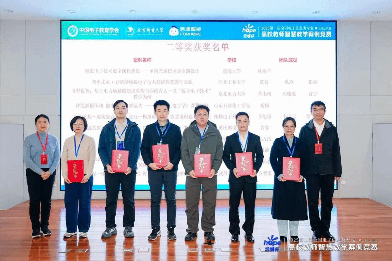 教师在智慧教学领域的创新能力和专业素养。参赛教师团队聚焦电子技术课程的教学重难点,深度融合人工智能、虚拟仿真等技术手段,辅以创新的教学模式和教学设计,将行业案例、科研成果与教学实践紧密结合,精心打磨教学案例,呈现出的鲜明的“新工科”特色、先进的教学理念和显著的实践成效,获得评委的高度认可。
