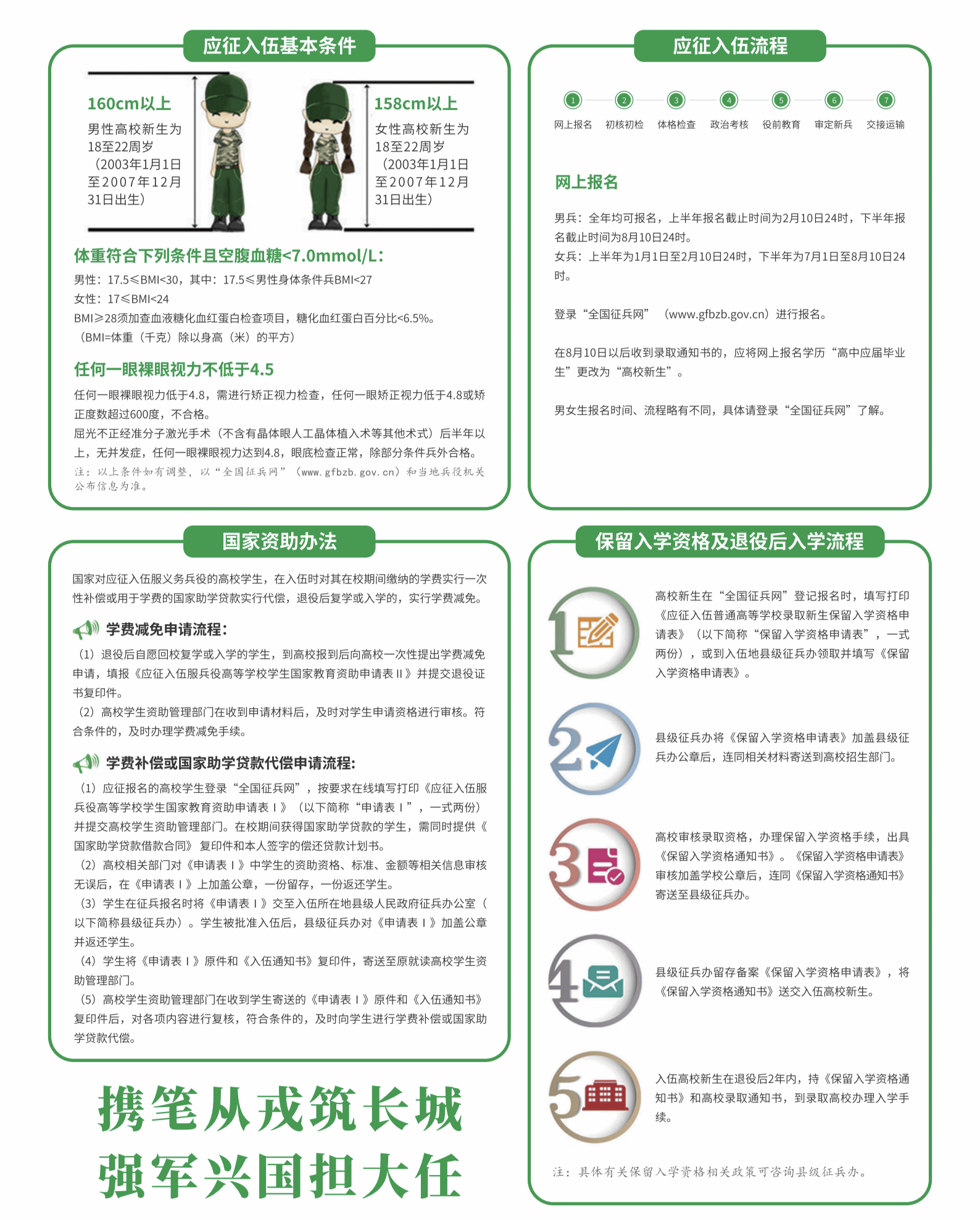 《中华人民共和国宪法》规定:“依照法律服兵役和参加民兵组织是中华人民共和国公民的光荣义务”。部队是青年学生成长成才的大学校,是砥砺品格、增强意志的好课堂,是施展才华、成就事业的大舞台。“生命里有了当兵的历史,一辈子都不会后悔”。国防和军队现代化建设,迫切需要一大批有责任、敢担当的有志青年携笔从戎、报效祖国。为鼓励大学生应征入伍,国家出台了一系列优惠政策,现寄上,供参考。