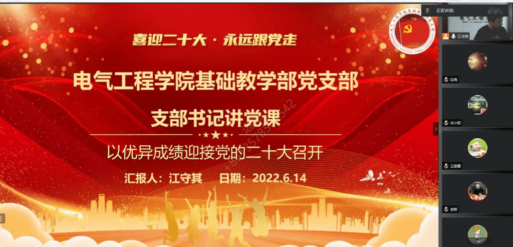 基础教学部党支部于6月14日下午开展以“喜迎二十大,永远跟党走”为主题的支部书记讲党课活动,深入贯彻落实“三会一课”制度,进一步提升支部学习质量。本次党课采取线上会议的形式,支部全体党员参加。