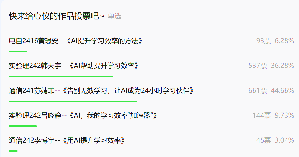 动画视频大赛以AI提升学习效率为主题,培养学生动画视频设计的综合实力,激发创作潜能。作品通过创新中心微信公众号发布,采用线上评审,以创意与原创性和视觉效果与声音设计两个角度,最终成绩由线上教师和学生评委评分两部分加权计算得出,最终评出一等奖1项,二等奖2项,三等奖2项,线上投票最高的作品同时获得最佳人气奖。