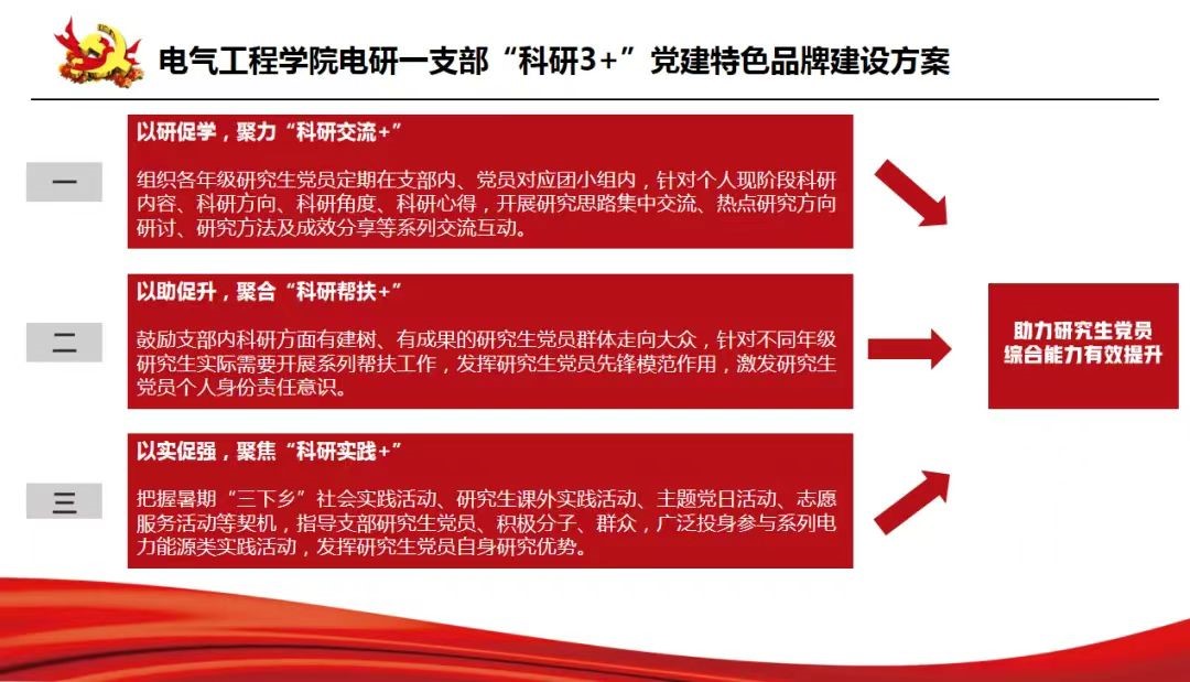 (四)完善“科研3+”党建特色品牌建设。坚持按照“科研3+”系列内容组织开展支部相关工作,并结合学校和学院党委工作部署,切实做到“以党建引领研究生科研创新,把支部组织优势转化为科研创新动力源”。