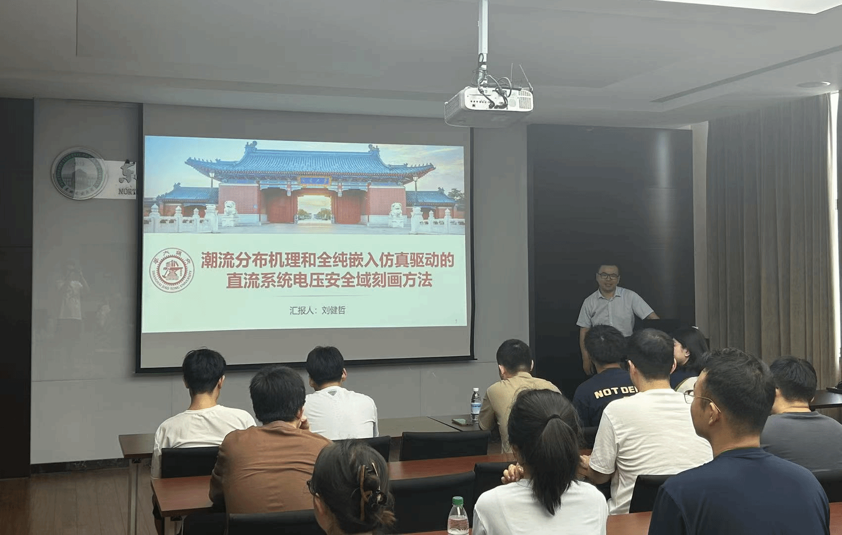 报告会上,刘健哲老师针对直流电力系统运行面临新挑战,分享了他在直流电力系统安全域方面的研究进展。首先,刘健哲老师结合直流电力系统状,阐明了刻画直流系统电压安全域的意义;然后,针对安全域刻画面临参数空间维度高、采样数据需求大、仿真计算速度慢的难题,提出采用全纯嵌入计算方法提升数值稳定性,从底层算法增强数值仿真的稳定性与计算效率,在上层仿真场景中构建加速机制,双维度缩短安全域刻画流程;最后,刘健哲老师为大家分享了直流系统电压安全域分析的创新方法与应用前景。