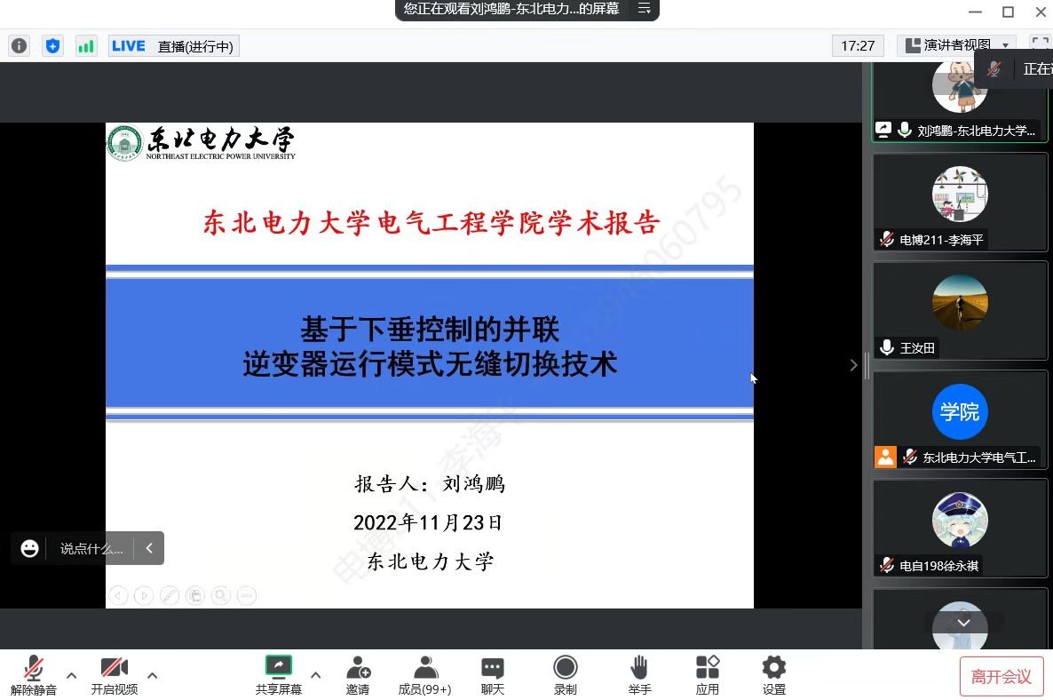 11月23日下午,学院刘鸿鹏教授通过腾讯会议方式作了题为《基于下垂控制的并联逆变器运行模式无缝切换策略技术》的线上学术报告,并在腾讯会议直播平台进行了直播。本次学术报告由王汝田教授主持,学院部分教师、研究生及本科学生在线聆听了本次学术报告。