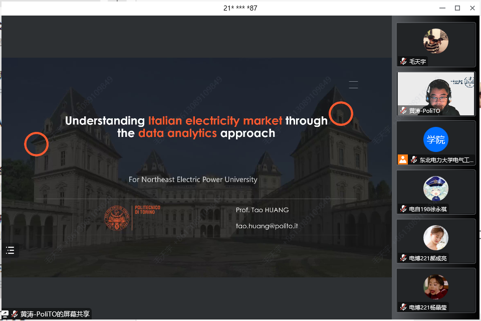 11月28日下午,应学院邀请意大利都灵理工大学黄涛教授通过腾讯会议方式作了题为《透过数据分析深入理解意大利电力市场》的线上学术报告,并在腾讯会议直播平台进行了直播。本次学术报告由姜涛教授主持,学院部分教师、研究生及本科学生在线聆听了本次学术报告。