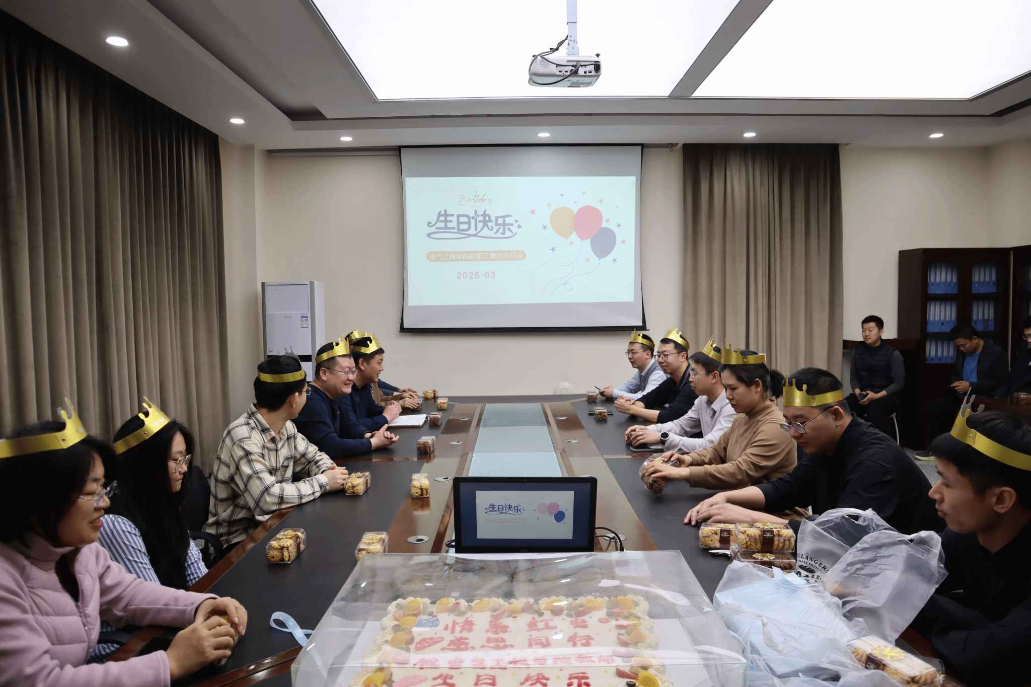 分工会“情系红电 感恩同行”教职工集体生日会在电动大楼A402拉开帷幕。学院领导以及2025年第一季度过生日的教师约20余人参加了本次活动。生日会由学院分工会主席陈恒阳主持。